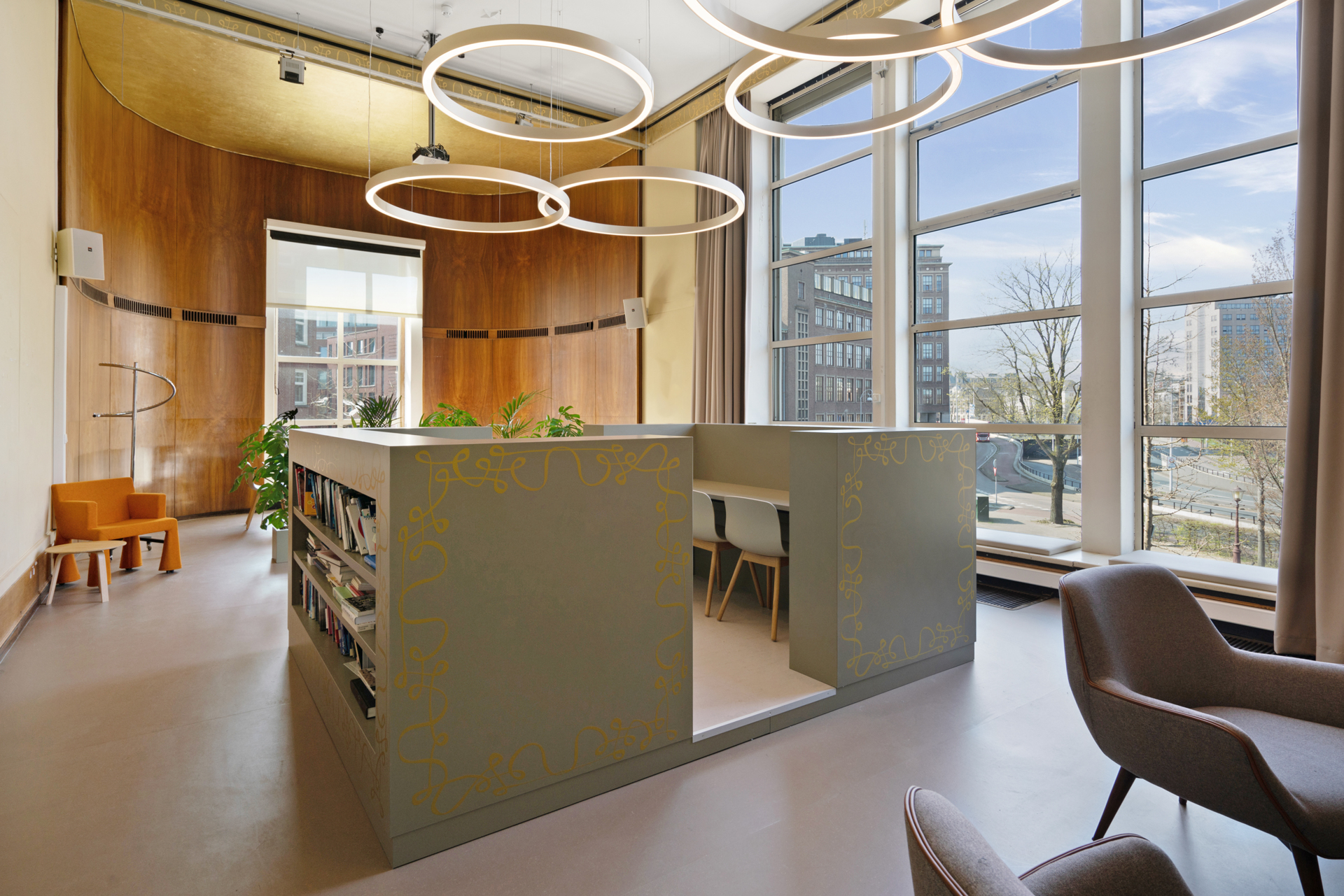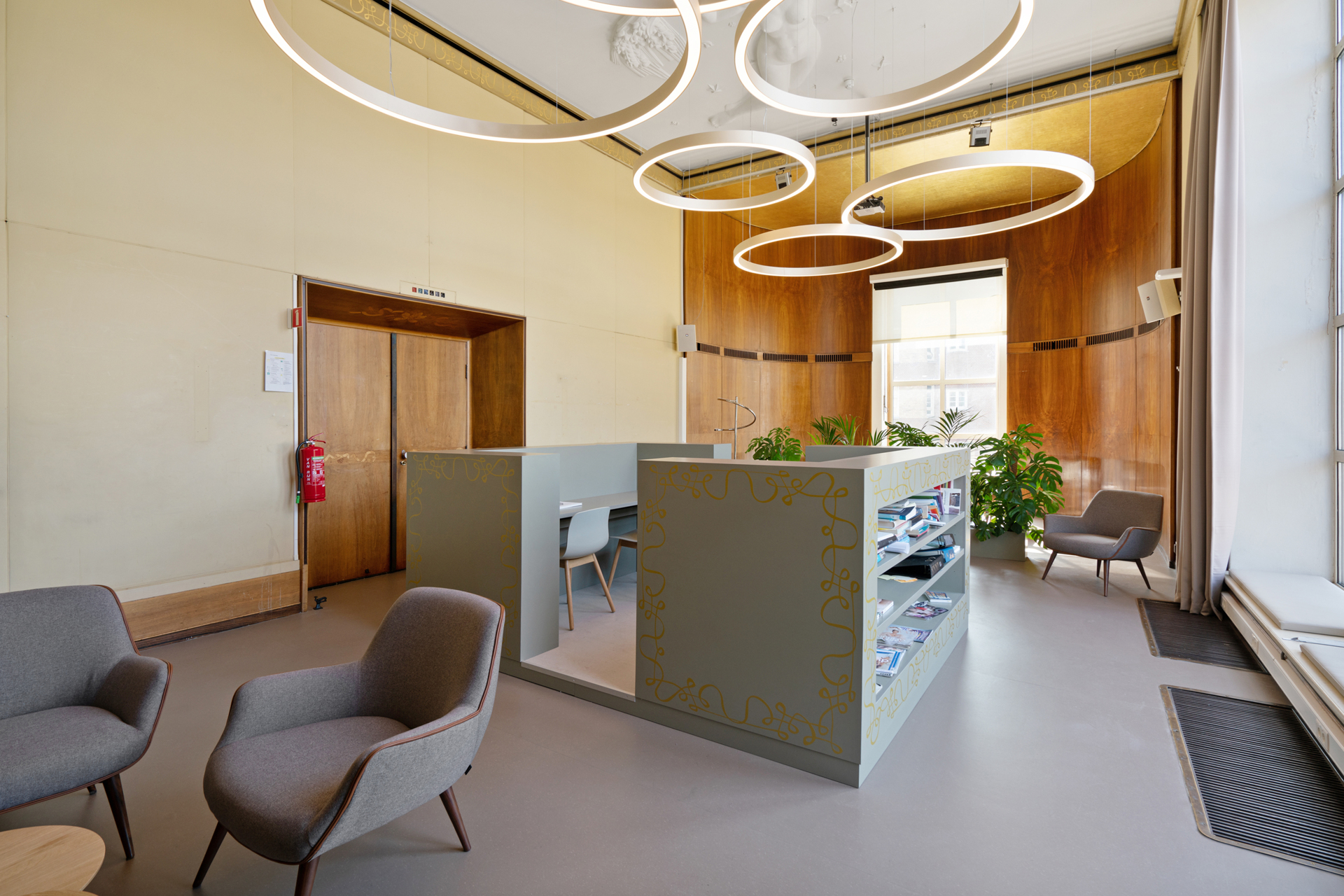Bij het nieuwe gebruik van de ruimte kwam de nadruk te liggen op ontmoeten, studeren en overleggen. Daarnaast was er de voorwaarde dat de herinrichting na de restauratie eenvoudig terug te plaatsen zou zijn. Geheel in lijn met de stijl van de oorspronkelijke ontwerp zijn we op zoek gegaan naar aanknopingspunten voor het ontwerp. Deze zijn met name gevonden in de keuze voor warme en zachte kleuren in het ontwerp. Door de ingrepen van een heldere en eigentijdse vormentaal te voorzien concurreren zij niet met het oorspronkelijke ontwerp. Het plafondreliëf hebben we als sierlijke accent weer terug laten komen in het studeermeubel.