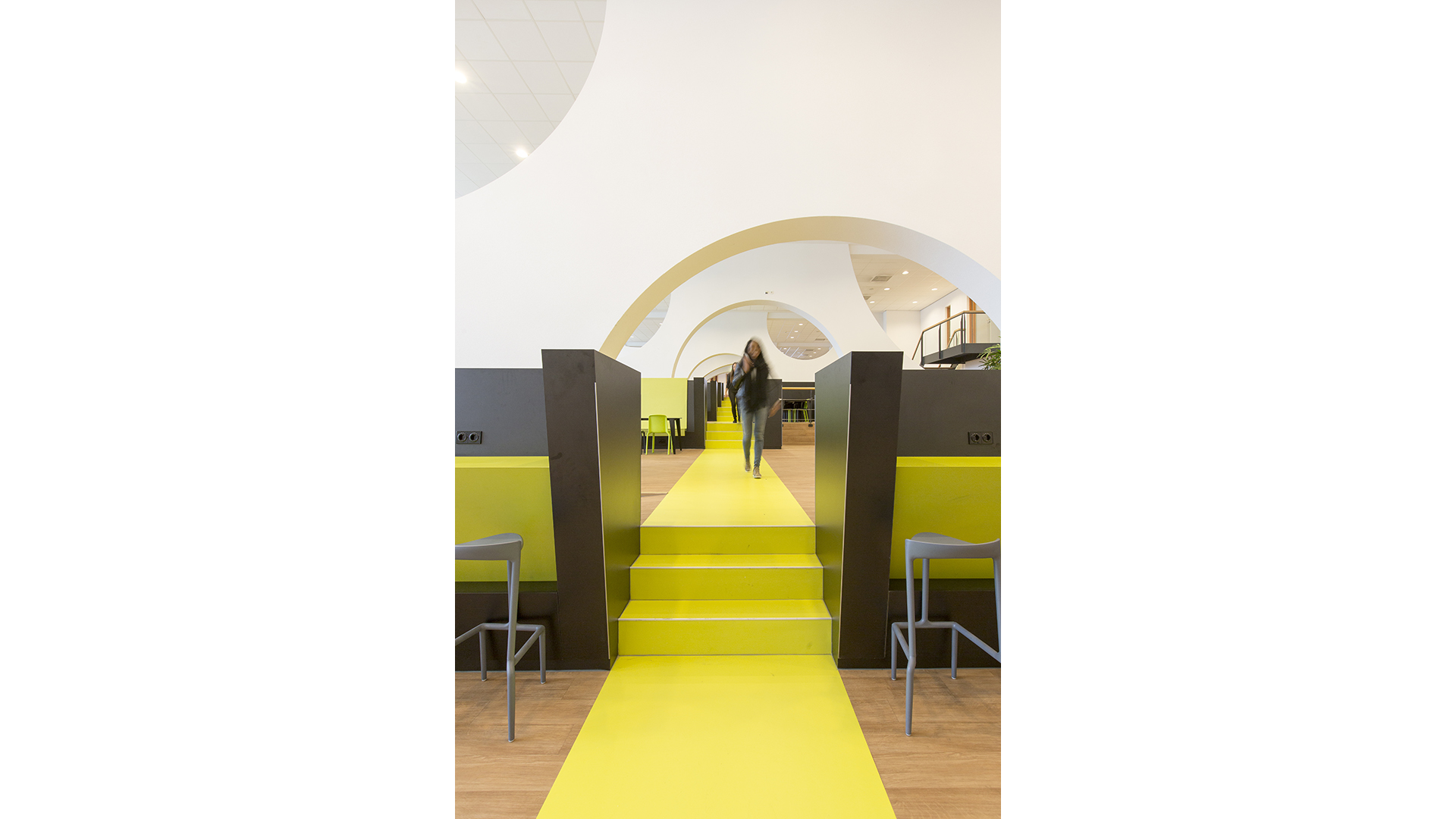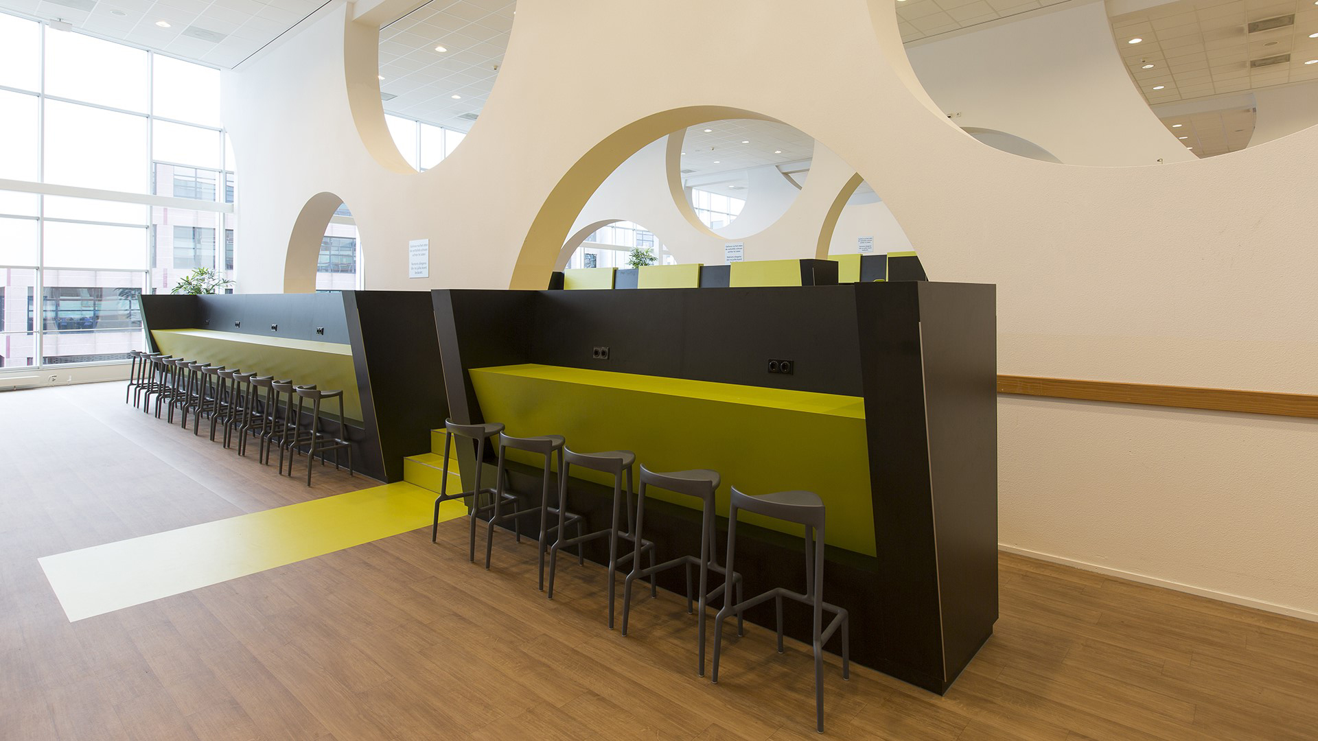 Om de ruimte beter inzetbaar te maken en meer sfeer te geven is er voor gekozen de beschikbare plateaus op een andere manier te gaan gebruiken. Om de onderling in hoogte verschillende plateaus te verbinden is een groene loper aangebracht. Beneden bij het startpunt ligt de nadruk op werken aan de bar maar gaandeweg verschuift het accent naar eten, drinken, werken en ontmoeten. Helemaal boven bevindt zich de loungezone met biljart- en voetbaltafels.