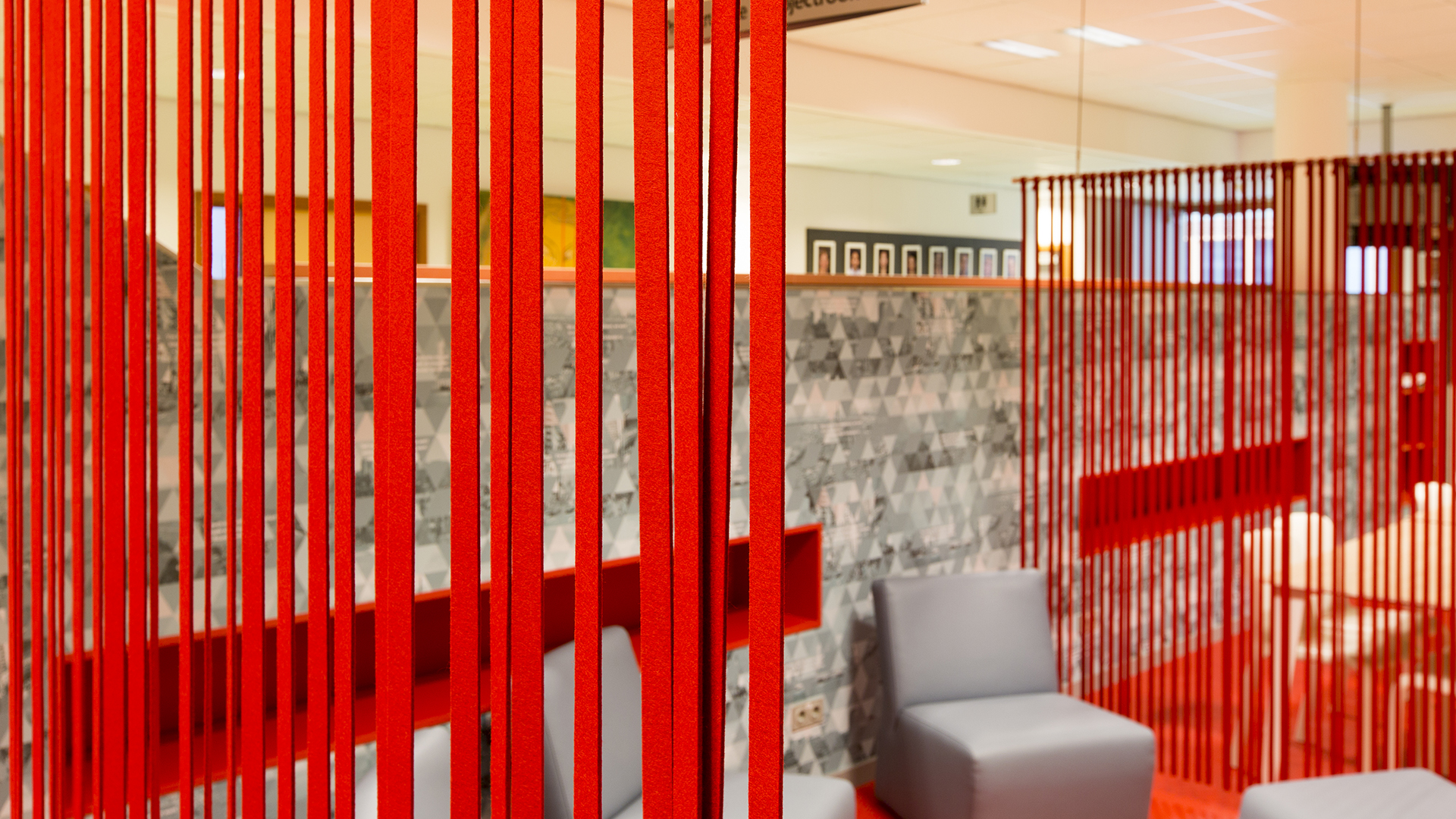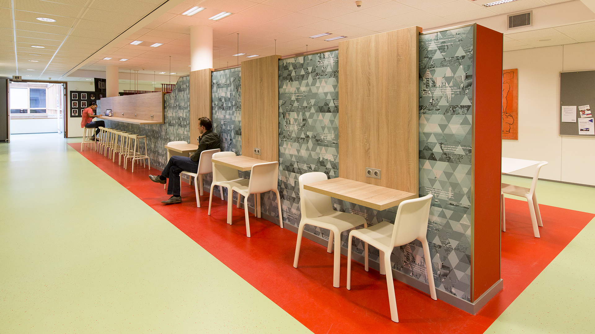 De inrichting maakte alle vormen van leren en overleg mogelijk via een langgerekt multifunctioneel meubel met werkzone aan een bar, overlegtafeltjes, leestafel en lounge-opstelling. Als drager van de identiteit is er een speciaal ontworpen behang toegepast. Dit eigentijdse toile behang bestaat uit de kenmerkende driehoeken van de HvA met daarachter geplaatste beelden die een gezicht geven aan de verschillende clusters.