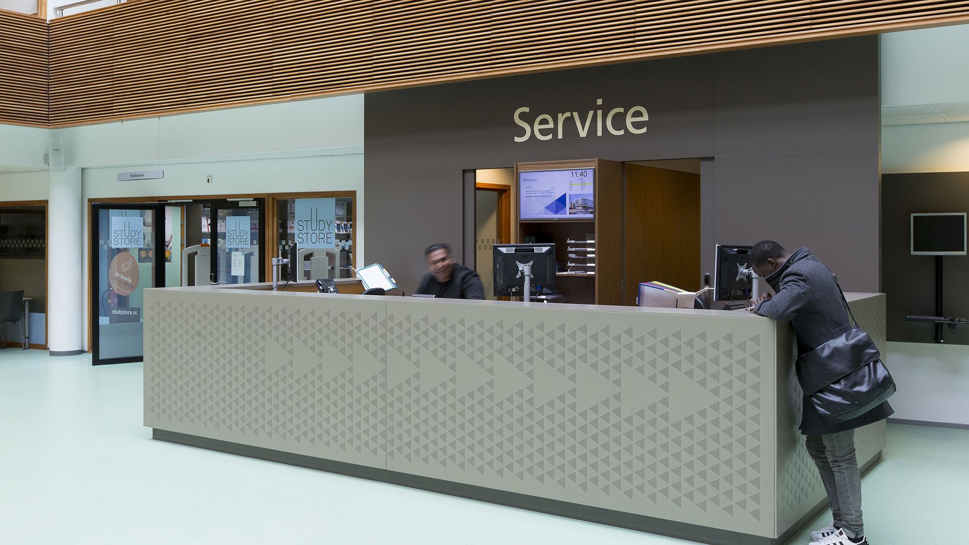 Om dit te bereiken zijn een viertal over het pand verspreide balies samengevoegd in één nieuw servicepunt en serviceplein. Daaraan gekoppeld zijn tevens de backoffices gereorganiseerd, verbouwd en dichterbij gesitueerd. Voor het plein zijn er op maat ontworpen flexibele meubels gerealiseerd die dienen als werkplek, uitgiftepunt en bar.