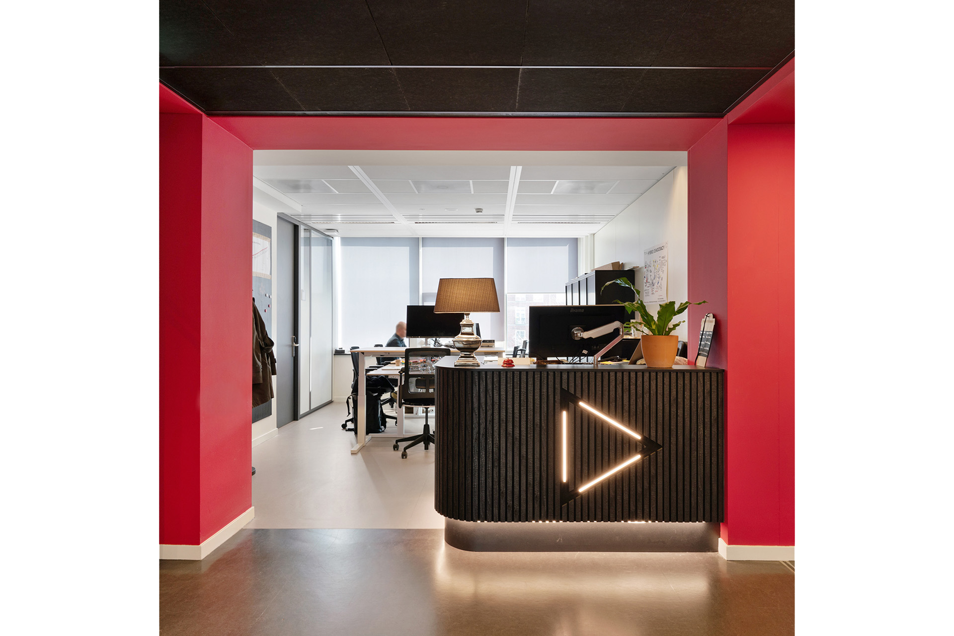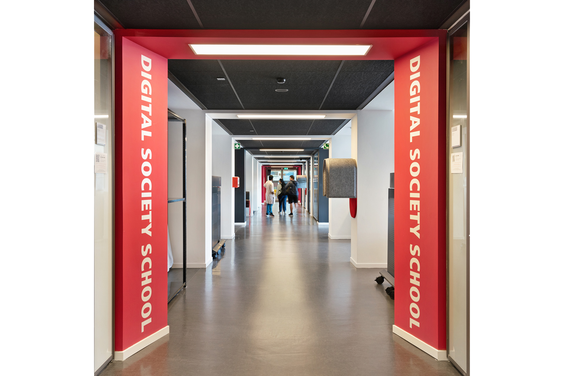 Om de constante verandering in indeling te combineren met een herkenbare identiteit, zijn de kolommen aan beide zijden van de gang uitgevoerd in een rode huisstijl van de DDS, waardoor de ruimte een eigen, dynamische karakter krijgt dat de identiteit van de Digital Society School benadrukt.