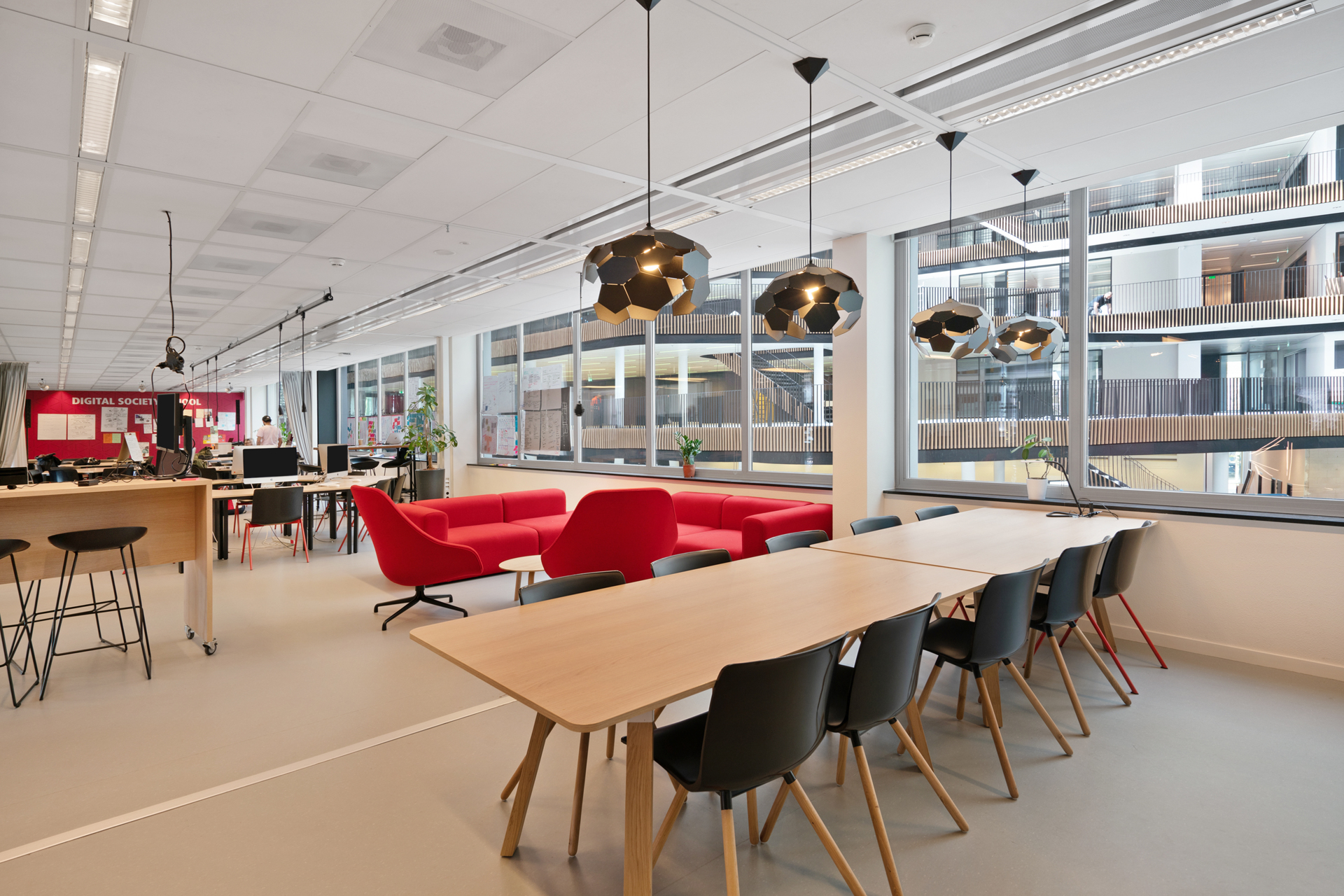 Het meest in het oog springend is de huisvesting van de Digital Society School op de 1e verdieping. De experimentele onderwijsmethoden die men hier toepast vragen om een flexibele plattegrond.
