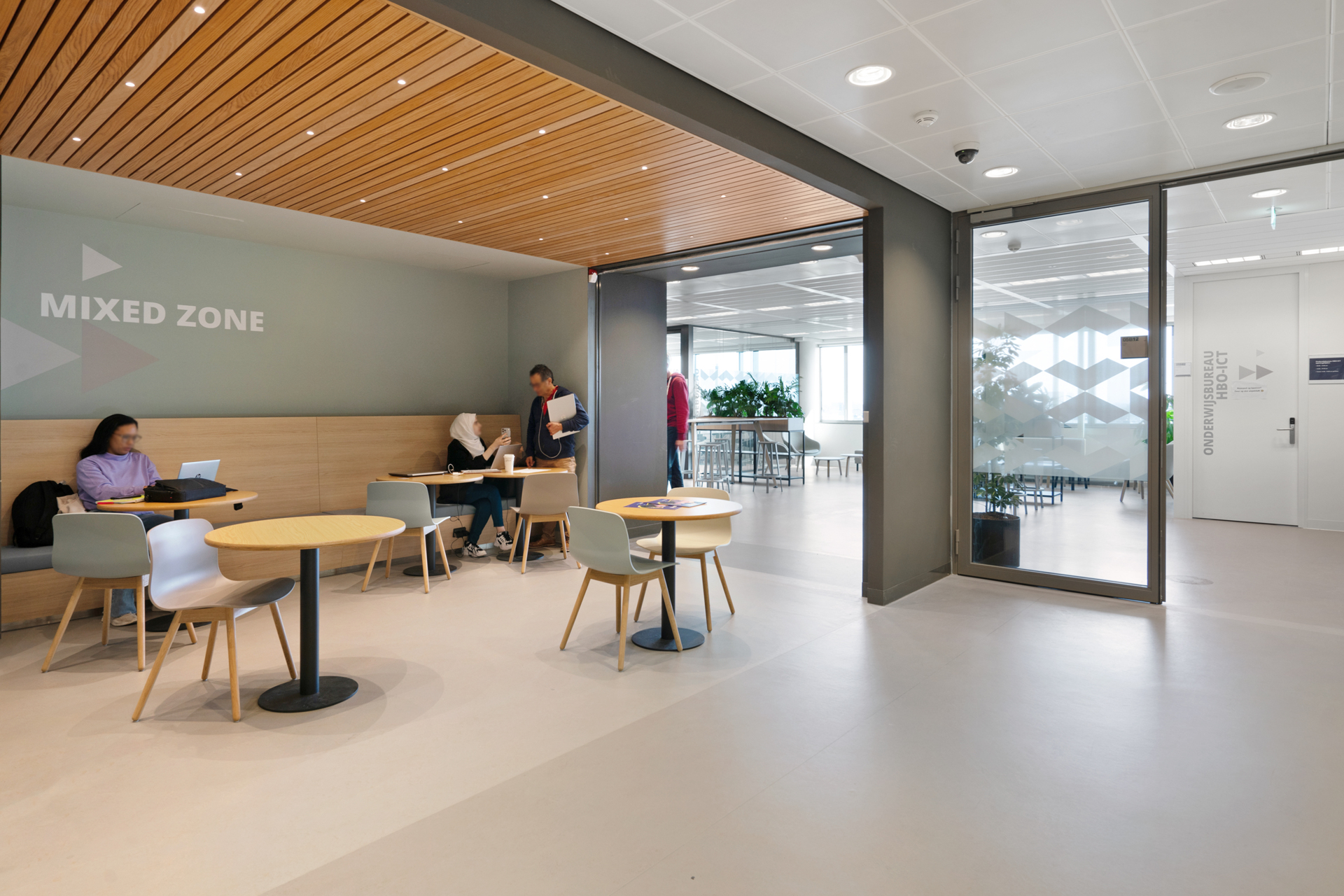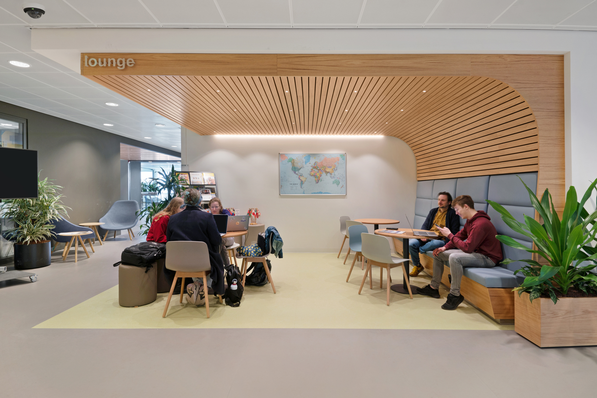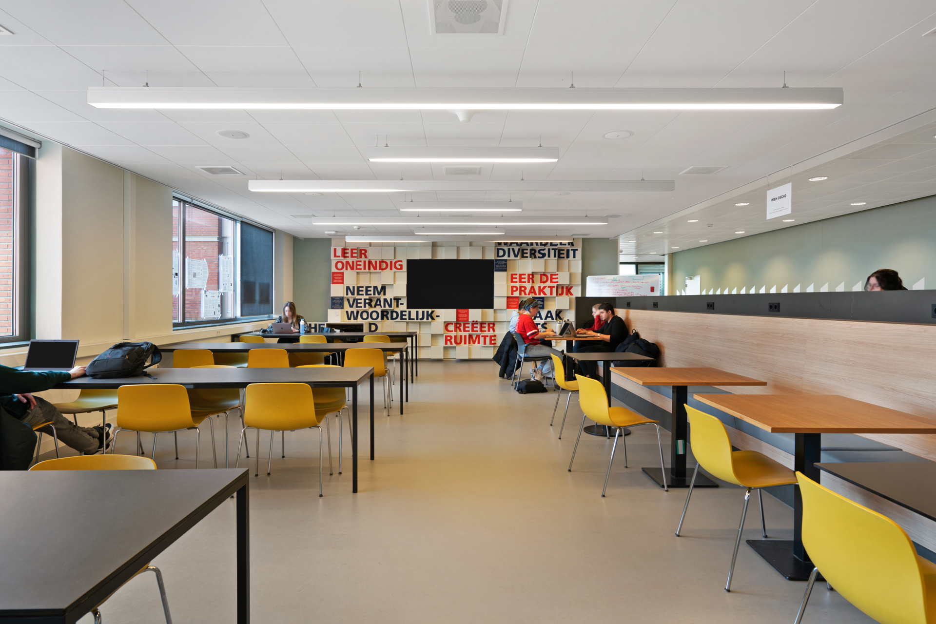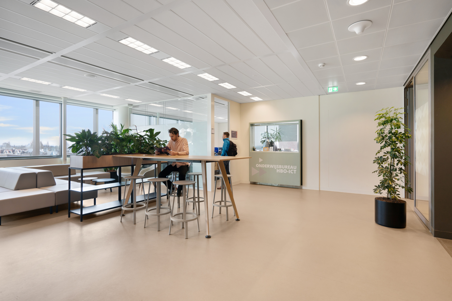 Op basis van deze behoeften en kernwoorden zijn wij samen met de opleiding op zoek gegaan naar een interessante mix van werken, ontmoeten en onderwijsruimten. Het gebouw is zodanig veranderd dat ontmoeten en het vinden waar je behoefte aan hebt vrijwel intuïtief mogelijk is. Om dit alles heel herkenbaar te verbinden is ervoor gekozen de huisstijl van de opleiding heel duidelijk in het ontwerp mee te nemen. Het resultaat is een zachte en harmonieuze mix van leren, werken en ontdekken.