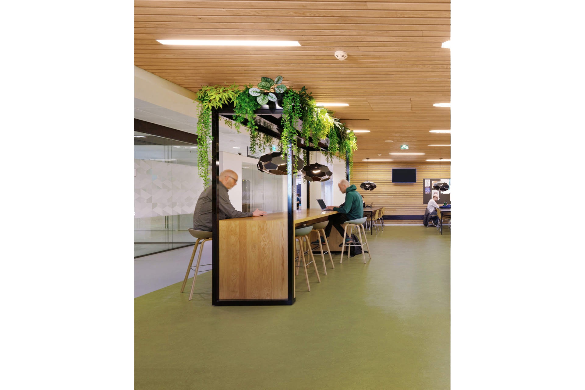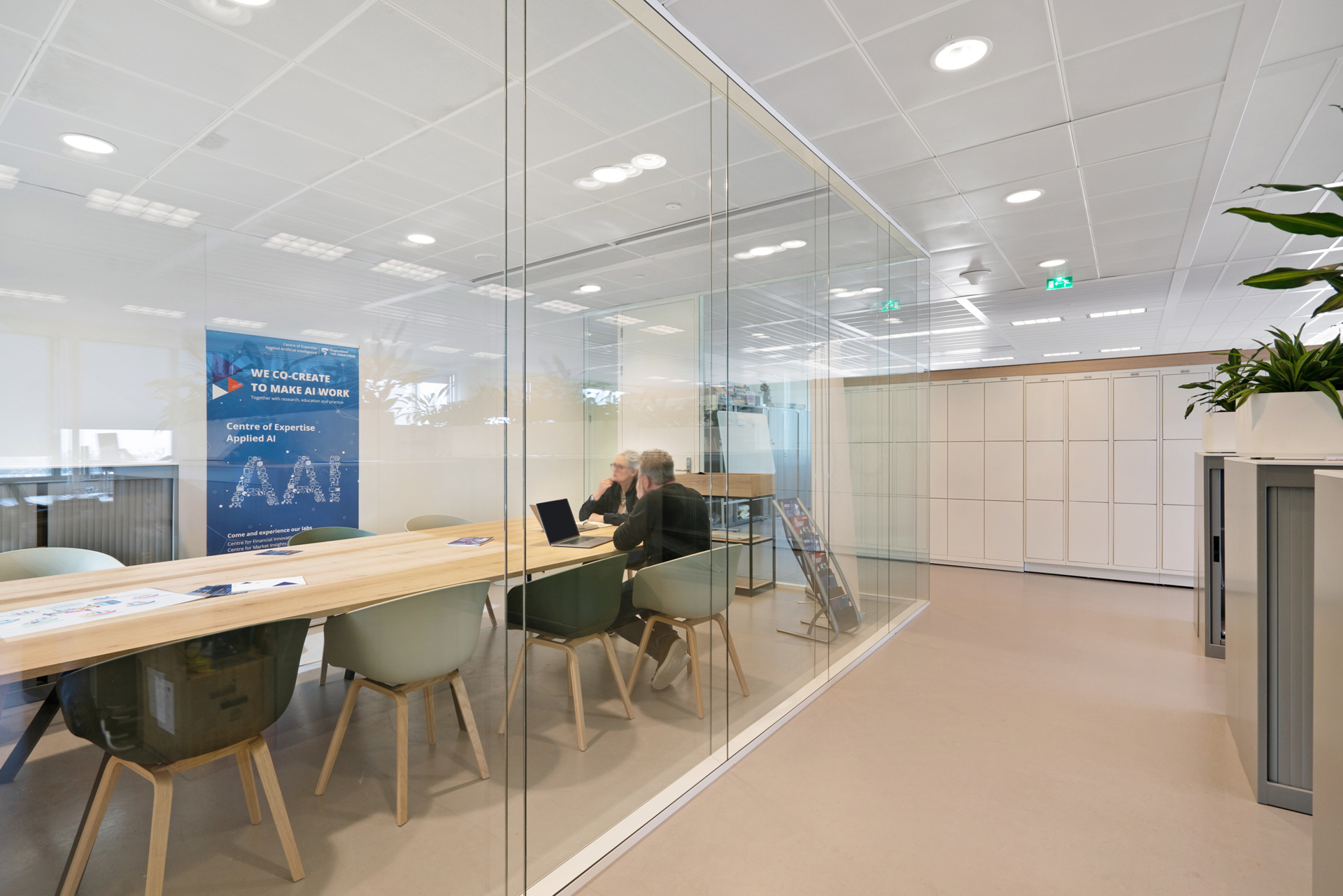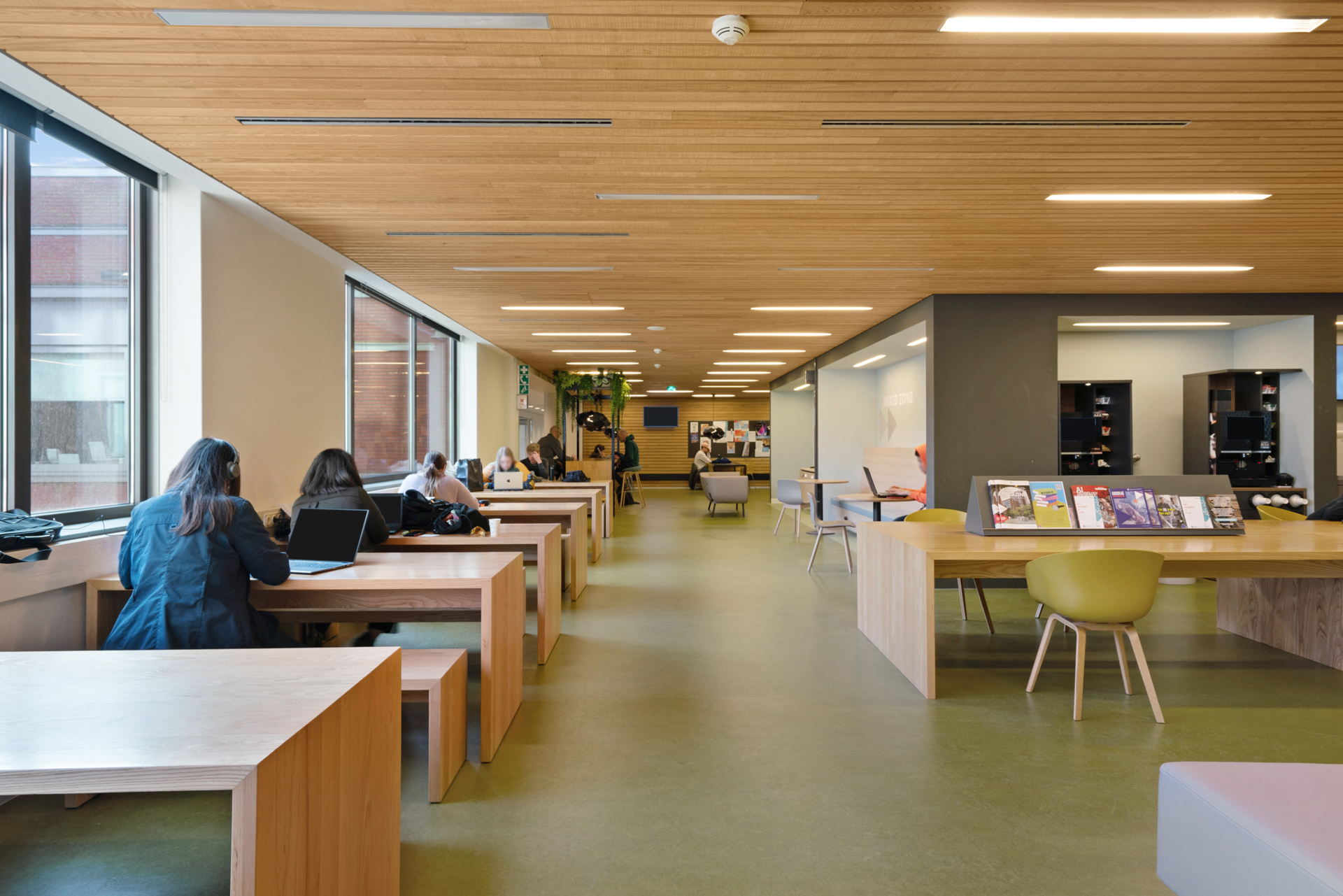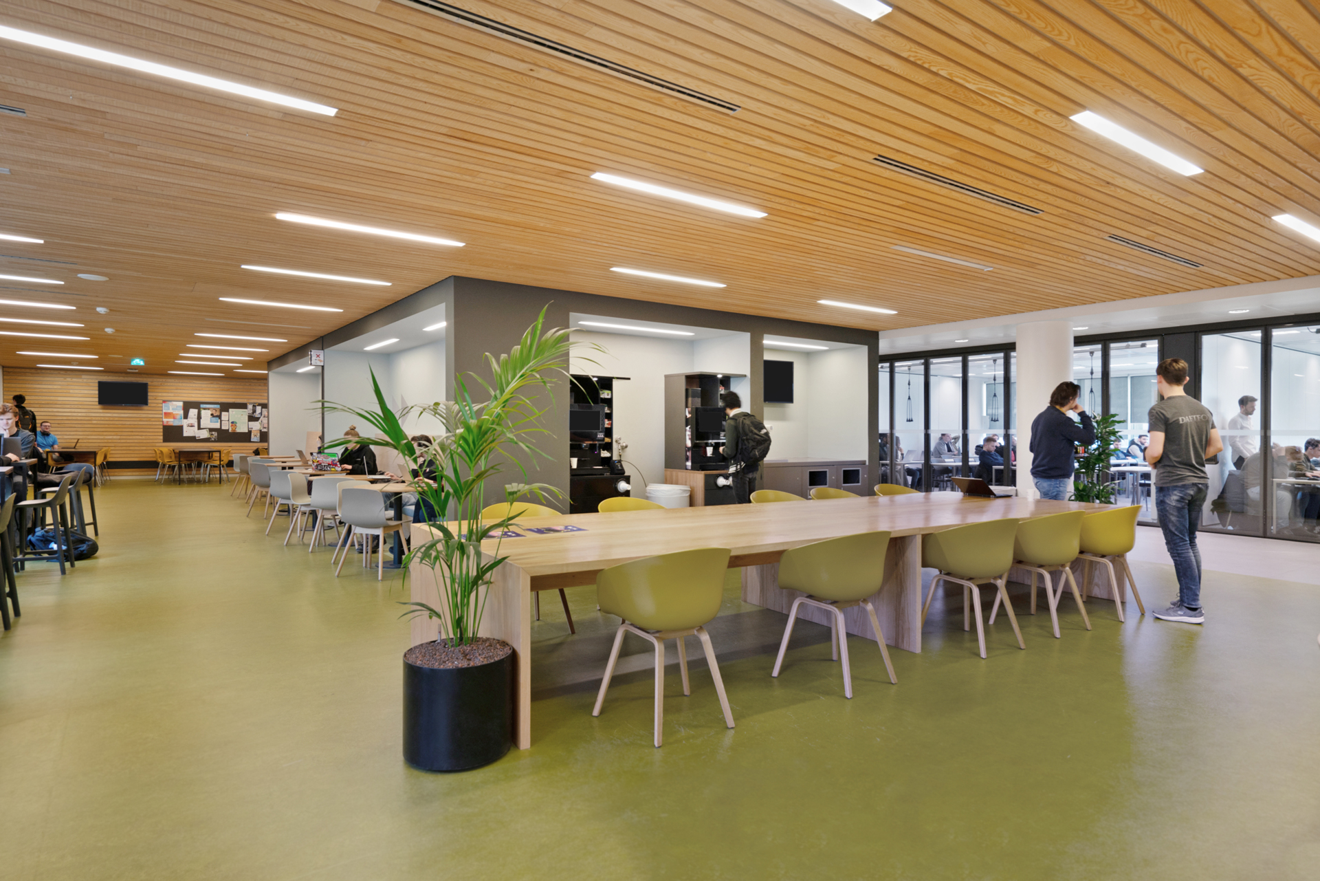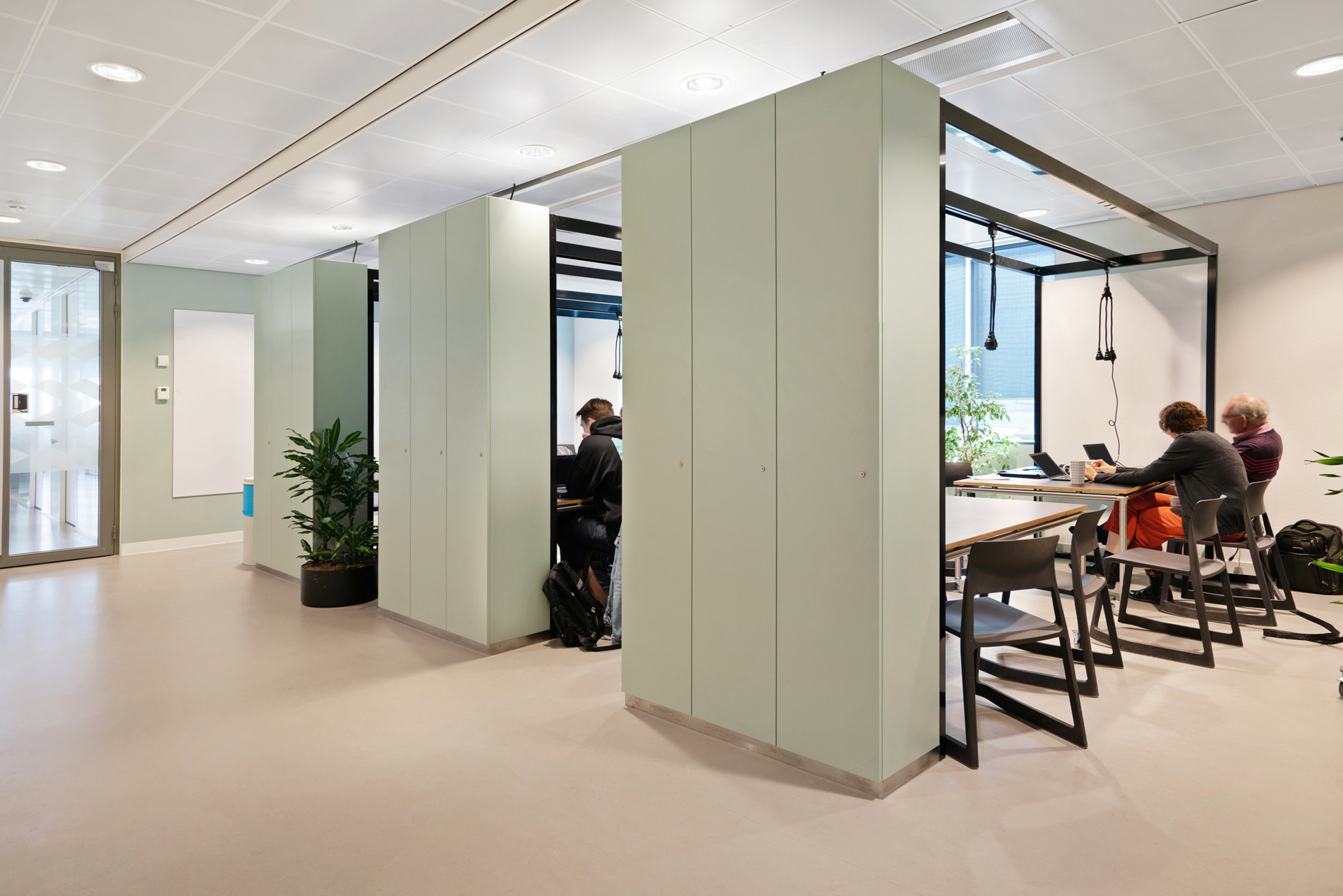 Op basis van deze behoeften en kernwoorden zijn wij samen met de opleiding op zoek gegaan naar een interessante mix van werken, ontmoeten en onderwijsruimten. Het gebouw is zodanig veranderd dat ontmoeten en het vinden waar je behoefte aan hebt vrijwel intuïtief mogelijk is. Om dit alles heel herkenbaar te verbinden is ervoor gekozen de huisstijl van de opleiding heel duidelijk in het ontwerp mee te nemen. Het resultaat is een zachte en harmonieuze mix van leren, werken en ontdekken.