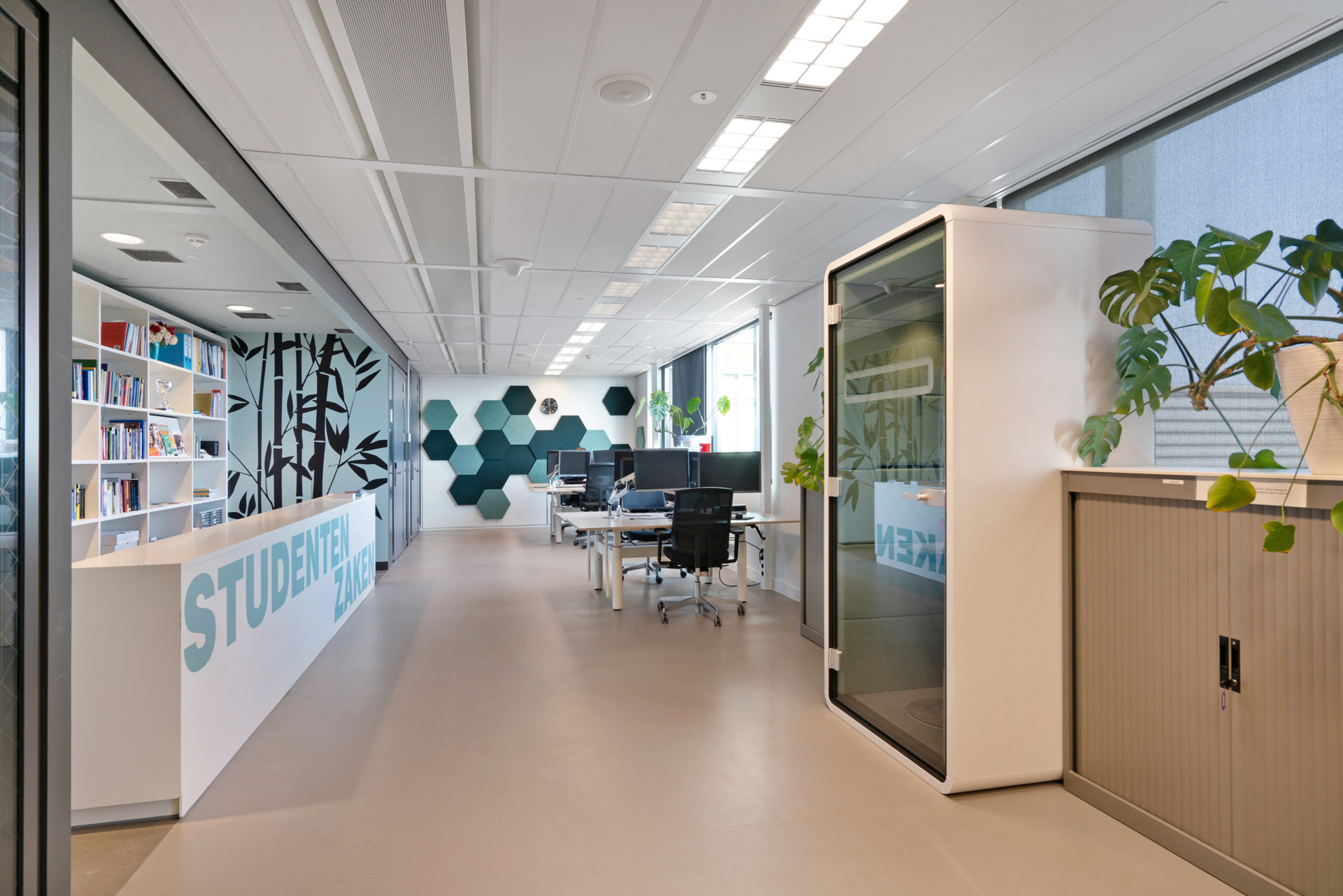 Bij de herinrichting van de afdeling studentzaken hebben wij aan de uitgangspunten “sober en doelmatig” invulling gegeven door zoveel mogelijk van het bestaande meubilair opnieuw te gebruiken.