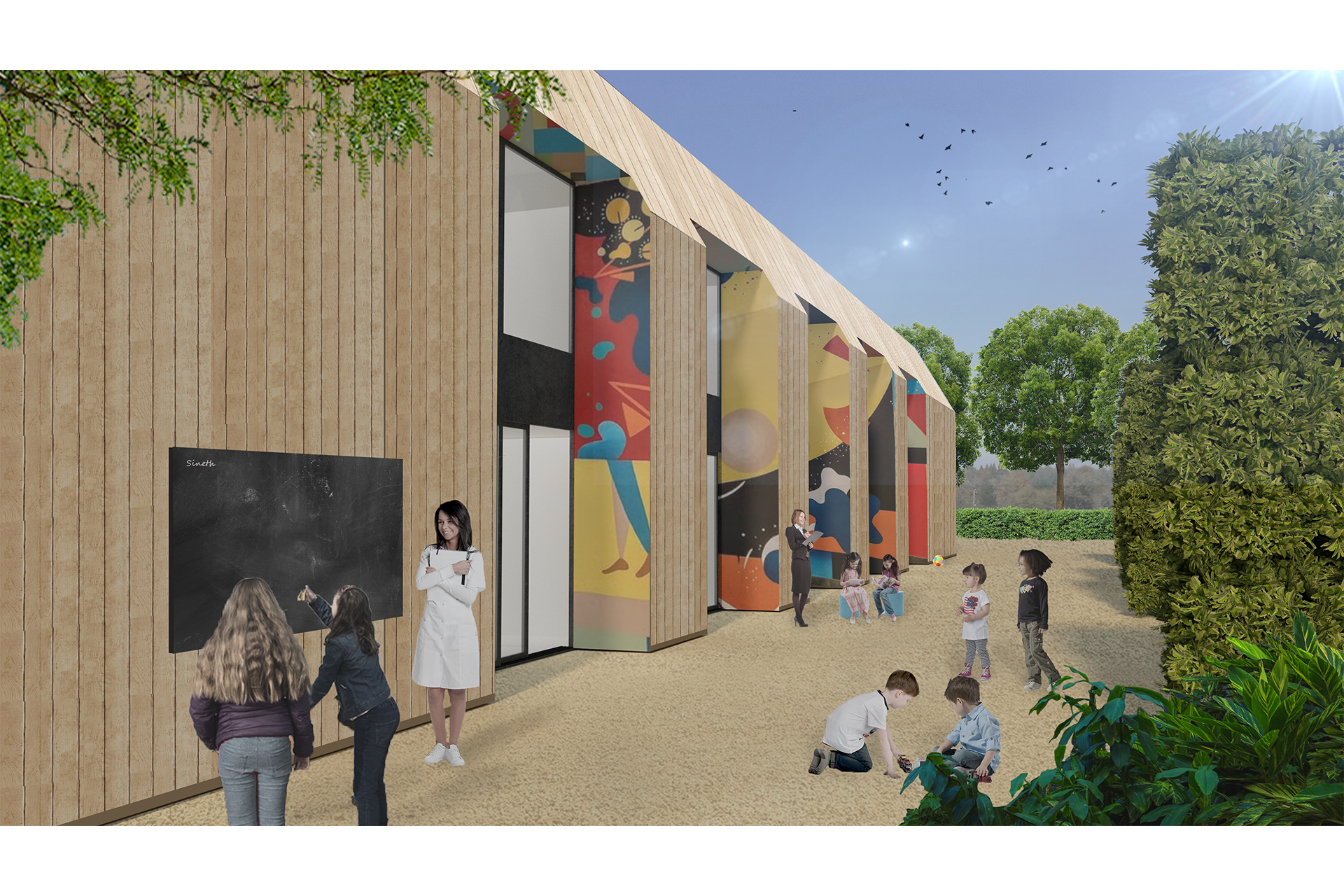 Voor de vormgeving zijn duurzame en circulaire materialen gebruikt, met een demontabele houtstructuur die herbruikbaar is. De houtconstructie draagt bij aan een natuurlijke uitstraling en een gezonde leeromgeving. Er is ruimte gereserveerd om de sfeer van het gebouw samen met het IKC vorm te geven, waardoor het een levende en dynamische ruimte blijft.