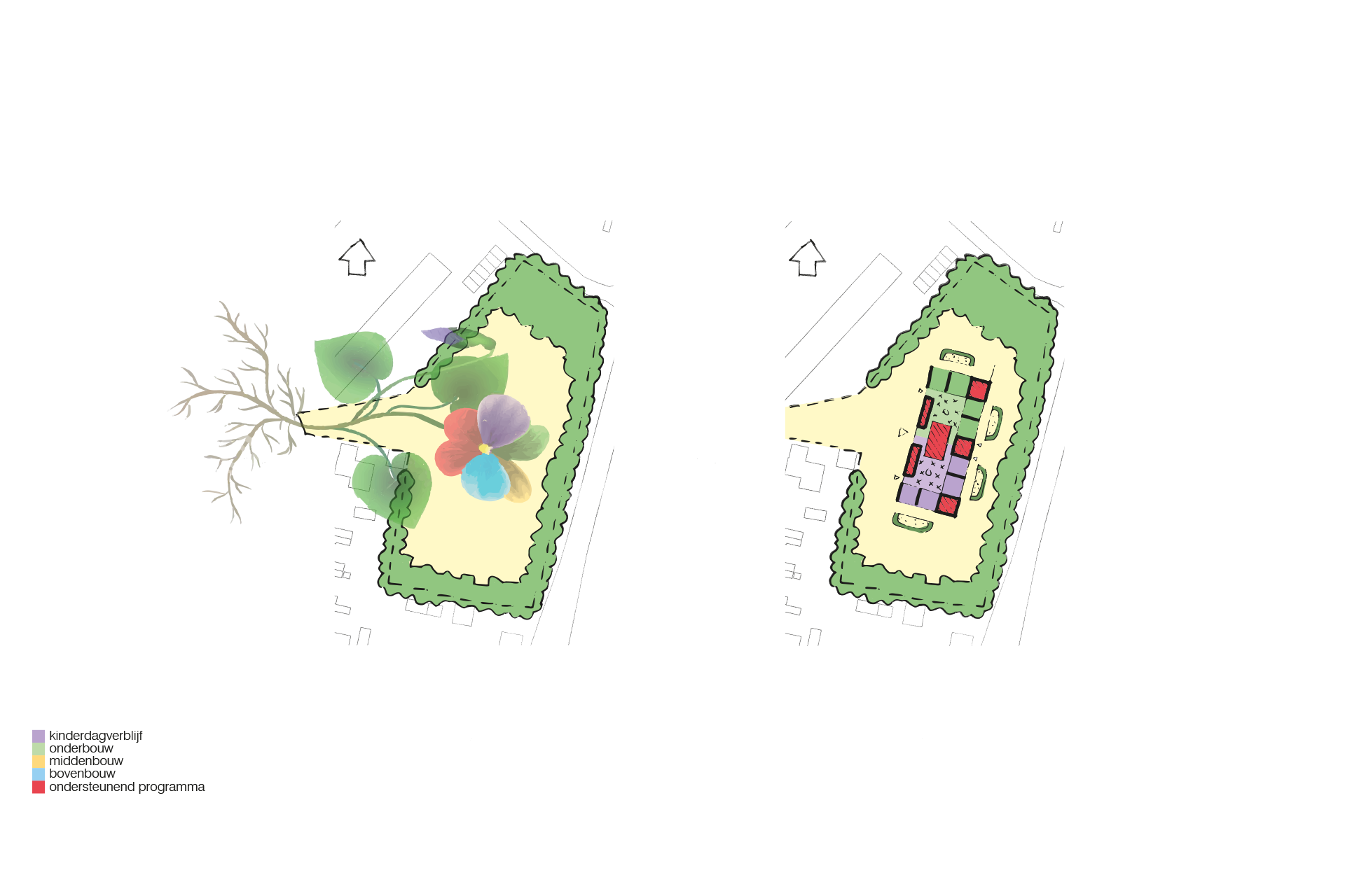 Om aan al gestelde eisen van het Kindcentrum (IKC) te voldoen, hebben we het ontwerpconcept van de “Bloem in het Groen” gepresenteerd. Dit idee betrof een educatieve leerweg per bouw met telkens het kind centraal. De knop van de bloem is het kind en ieder blad een “bouw” (onder-, midden- en bovenbouw) met daarnaast de vormende ondersteuning van docenten, ouders en de buurt.