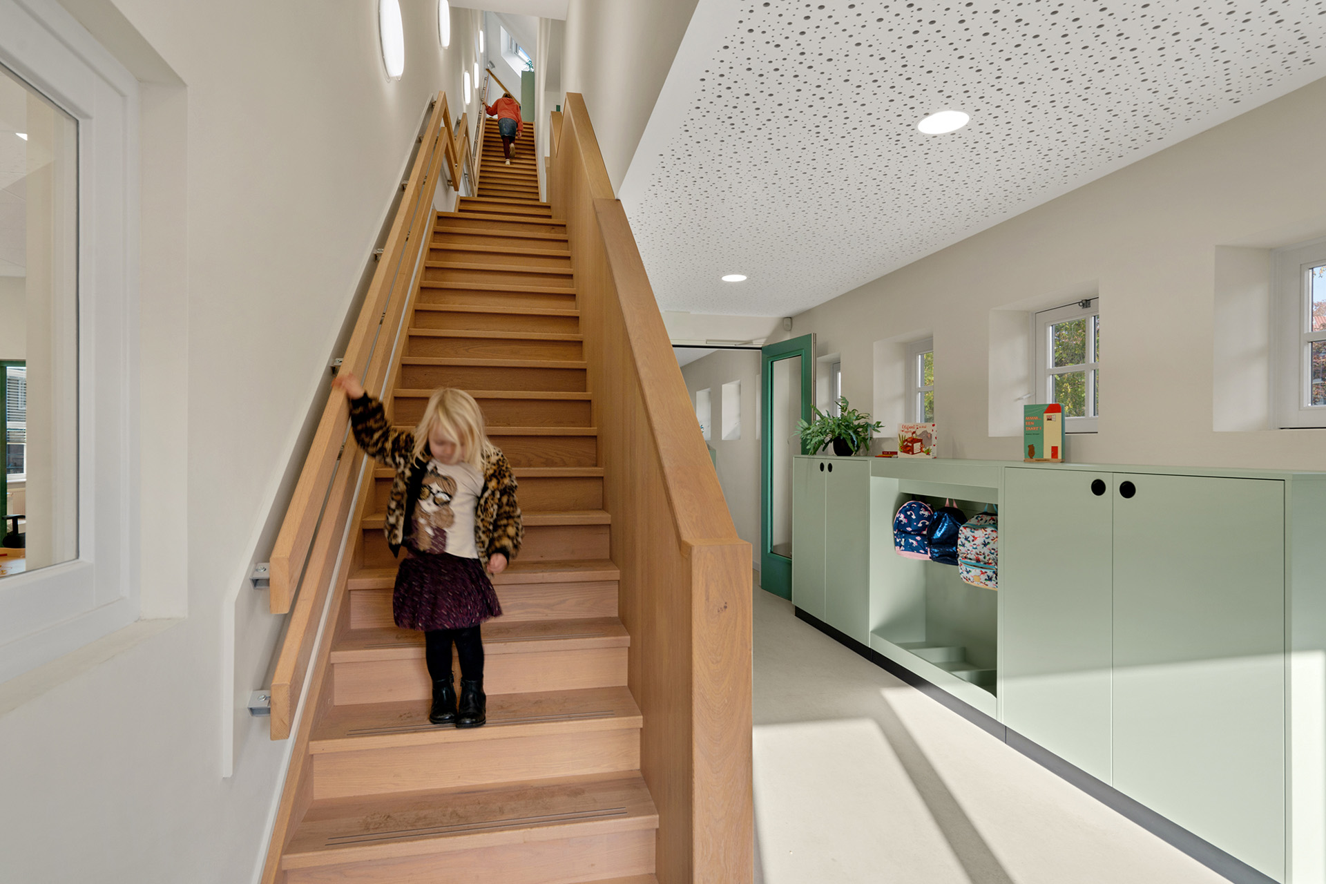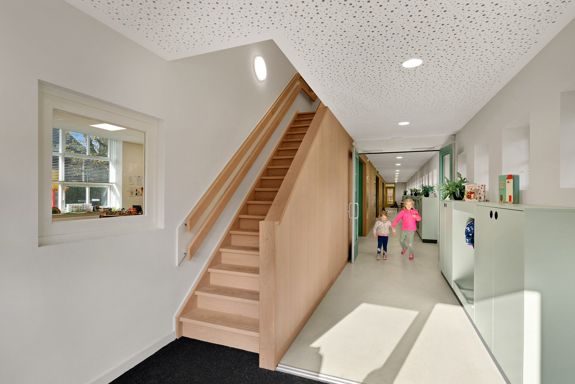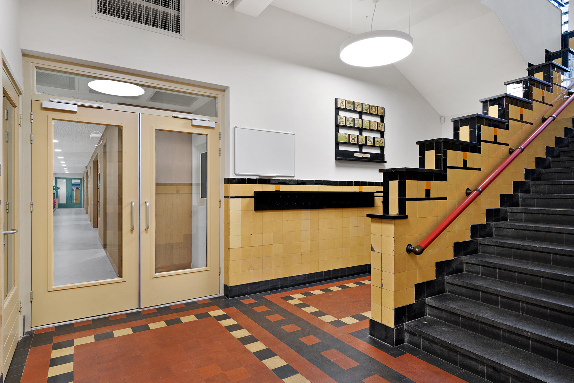 Met oog voor detail en kennis van de monumentale onderdelen hebben wij een ontwerp gemaakt waarbij delen van het centrale trappenhuis kunnen worden ingezet voor onderwijs. De opgesplitste en versleten trap is vervangen door een prachtige nieuwe eikenhouten trap. Op een zelfde wijze is ook de vluchttrap anders geplaatst. Door deze trappen slimmer te plaatsen kon de ruimte die eerder verloren ging nu gebruikt worden. Daarnaast zijn de gangen lichter gemaakt door de toiletgroepen te verplaatsen, waardoor ook de gangzones kunnen worden ingezet om in groepjes te werken.