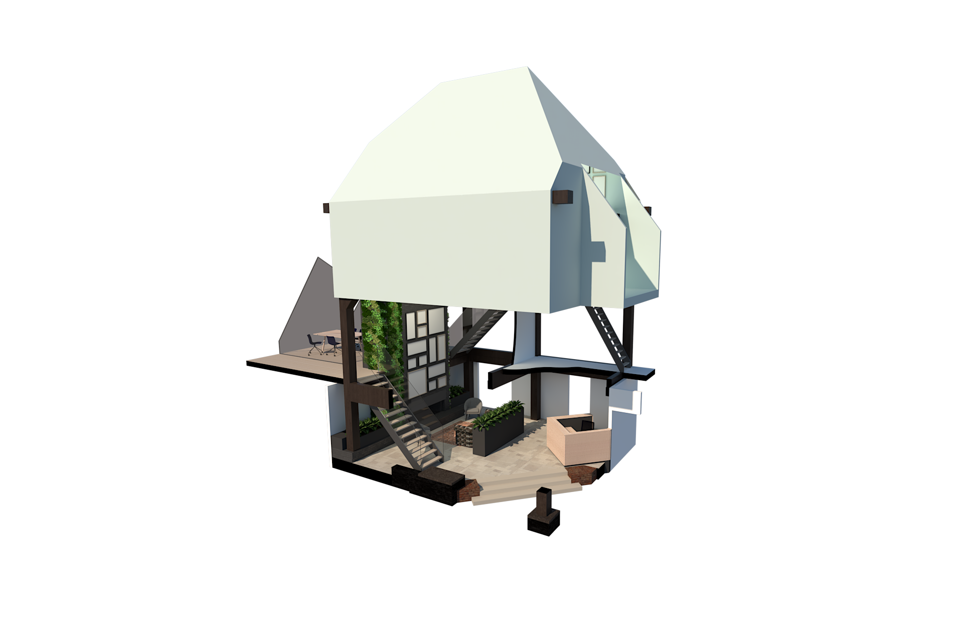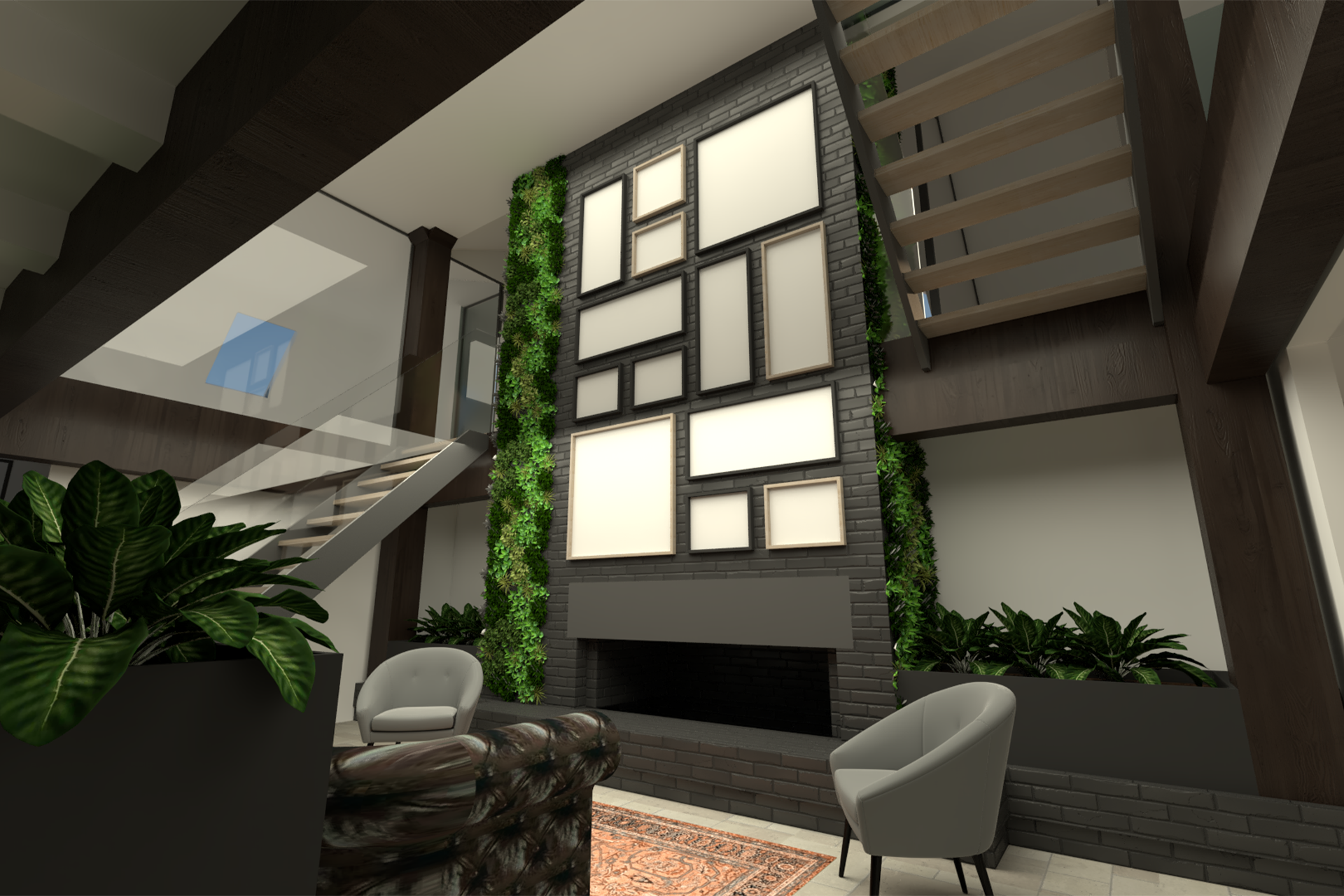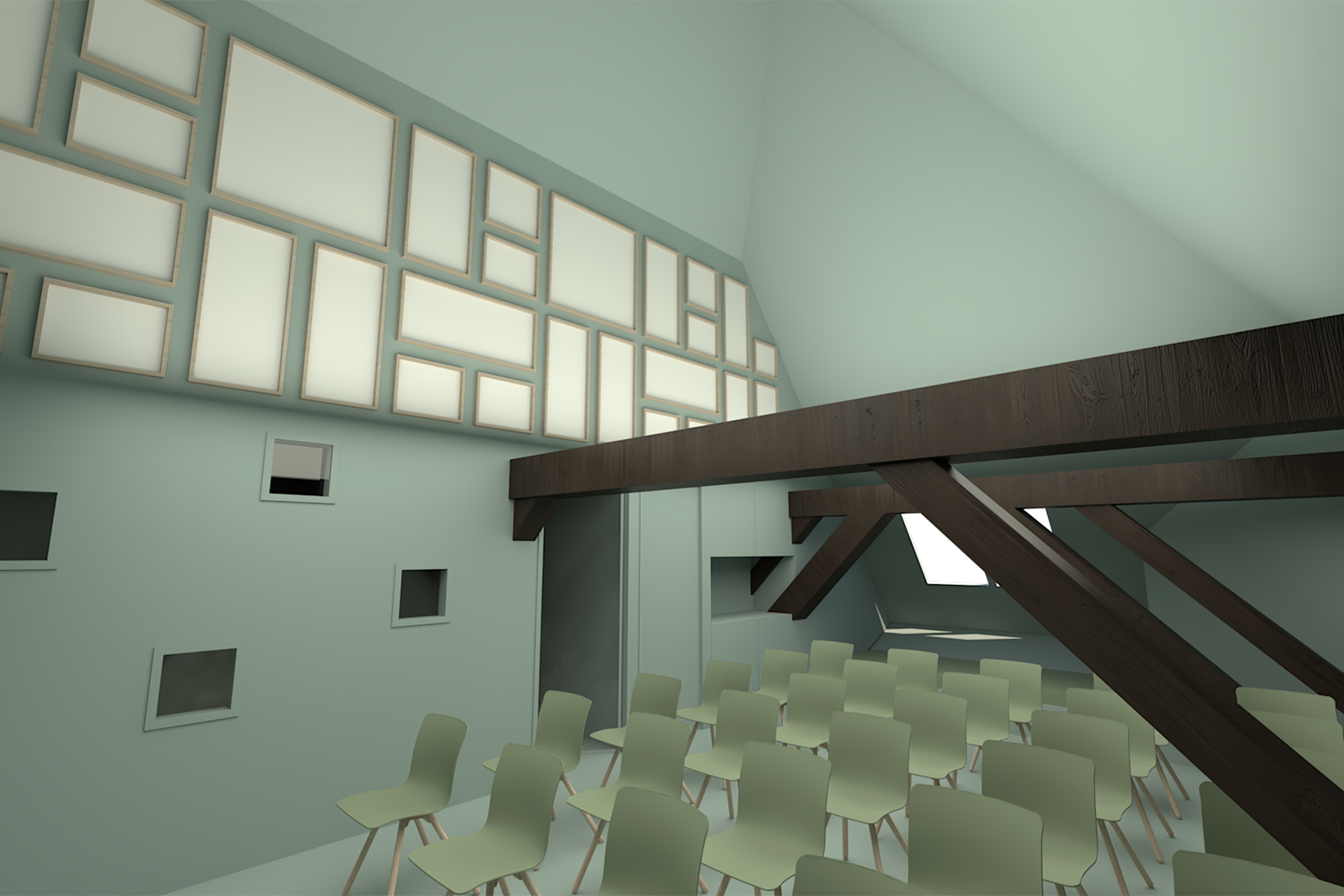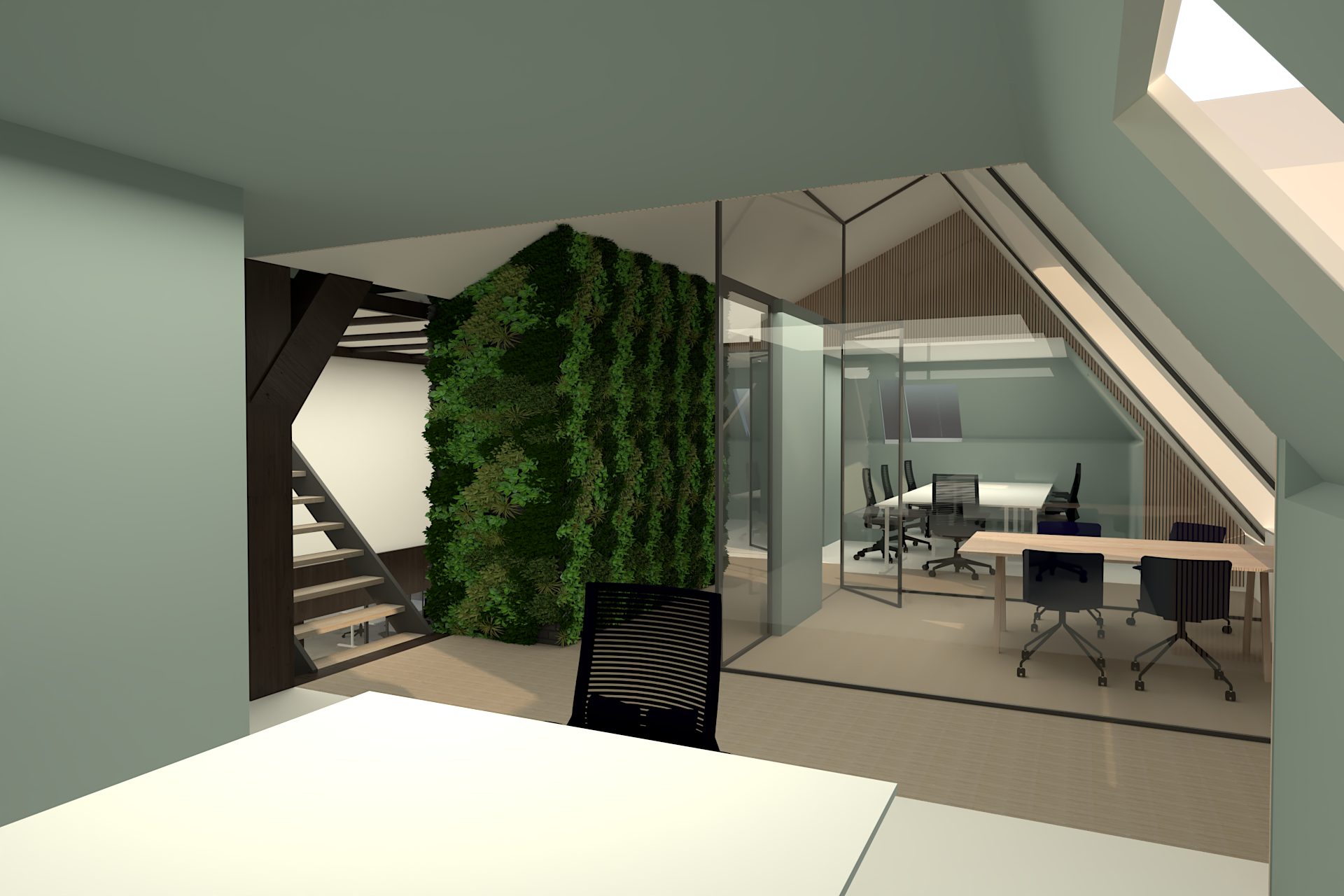 Het “vierkant” werd hierin het centrale en verbindende hart van de boerderij, waarbij het diende als referentiepunt voor de indeling van de ruimte. Dit Symbool van stabiliteit en evenwicht bracht de traditionele architectuur van de stolpboerderij samen met de moderne, functionele inrichting van het kantoor. De keuze voor het vierkant als conceptueel uitgangspunt weerspiegelt de balans tussen de respect voor historische elementen van het gebouw en de noodzaak voor functionaliteit en esthetiek in het hedendaagse interieur.