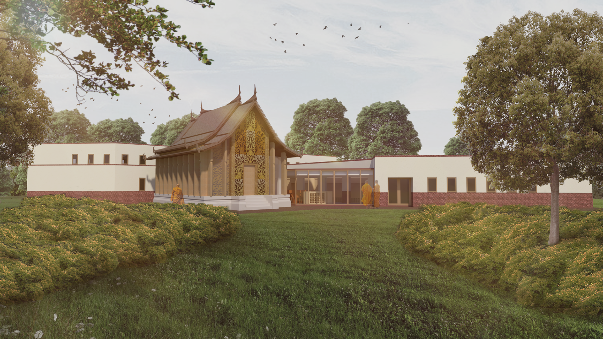 Het zoeken naar een harmonieuze balans tussen een Aziatische traditie en een Europese context was een belangrijk uitgangspunt bij deze opgave. Het doel hierbij was het beste van twee werelden samen te brengen. De sobere en ritmische gevelindeling van het hoofdgebouw, opgetrokken uit baksteen en stucwerk benadrukken de Europese inbedding. Het voorziet het gebouw van orde en rust. De Thaise stijl en typologie van de tempel zorgen er voor dat dit gebouw het stralende middelpunt wordt van het geheel.