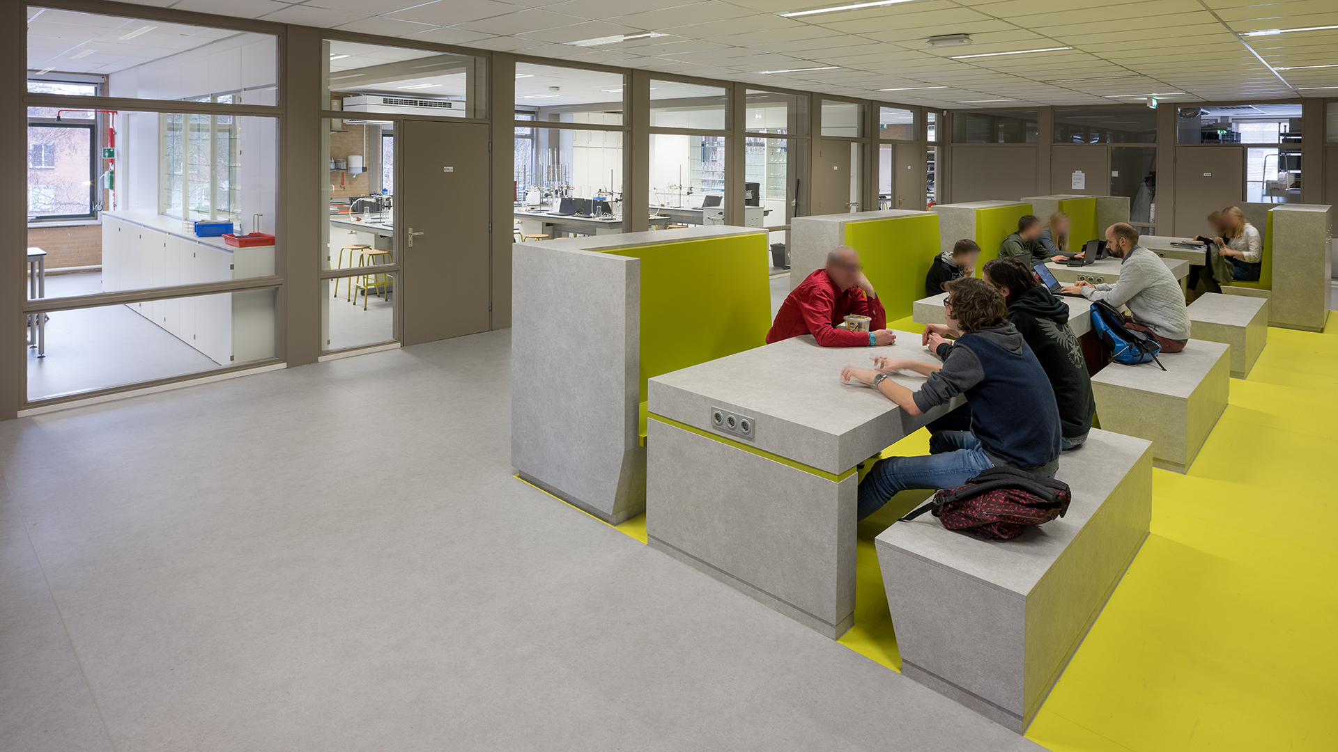 Van alle gebruikers van de B-toren is de BiNaS-sectie de grootste. Er was de uitdrukkelijke wens om biologie, natuurkunde en scheikunde niet als losse vakken te benaderen maar te integreren in een open lab-omgeving gekoppeld aan een studielandschap. Dit is gelukt door de TOA-ruimten centraal te plaatsen tussen de lokalen en de lokalen zo in te richten dat zij zowel voor klassikaal als voor lab-onderwijs kunnen worden ingezet. Visueel zijn deze ruimten verbonden met een doorkijk verwerkt in de kasten. Naast de TOA-ruimte bevindt zich het studielandschap waar samengewerkt kan worden aan projecten en opdrachten.